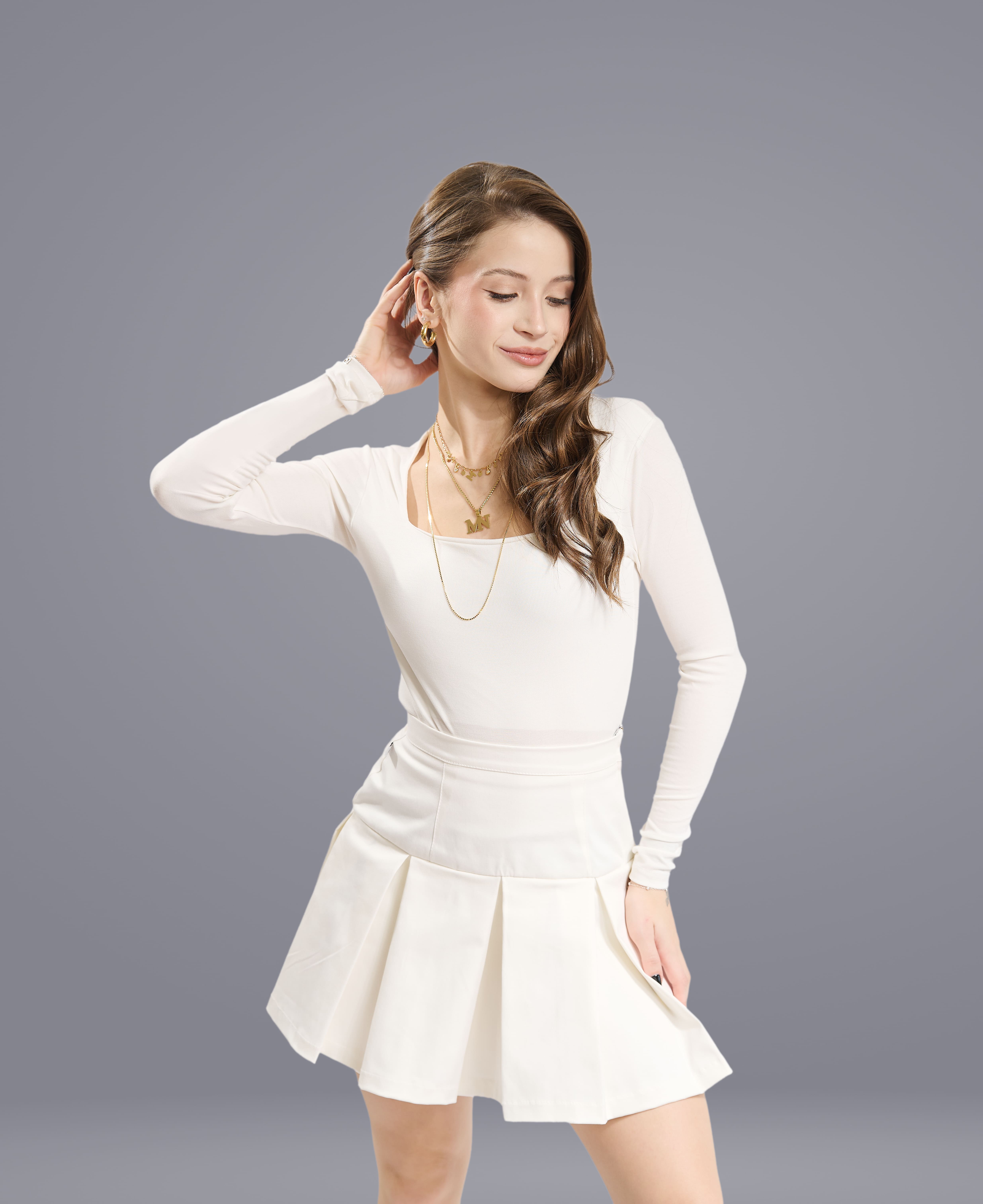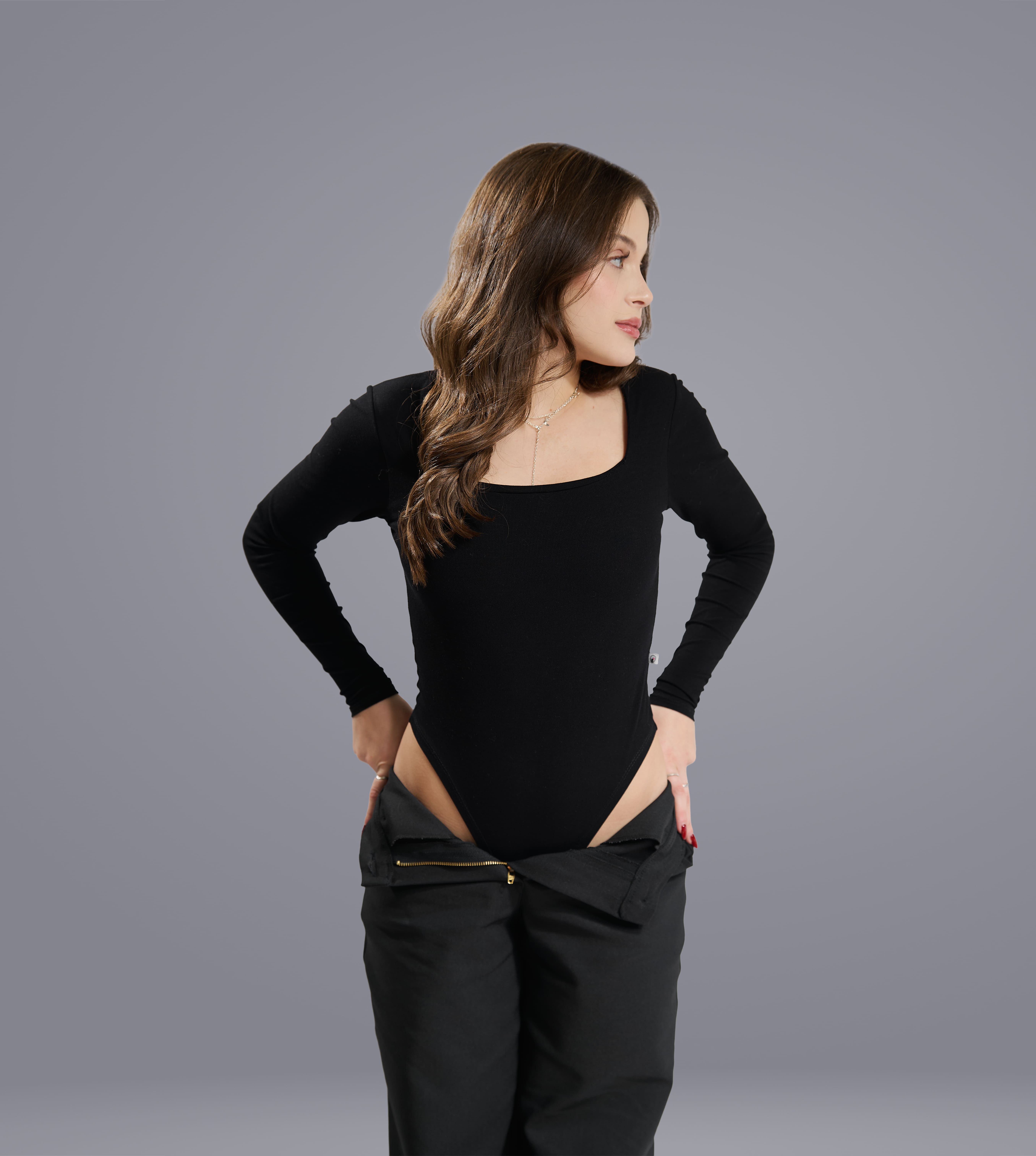 Body fio dental com decote quadrado e manga longa, que valoriza o colo com elegância. Possui fecho inferior confortável e modelagem ajustada ao corpo.
