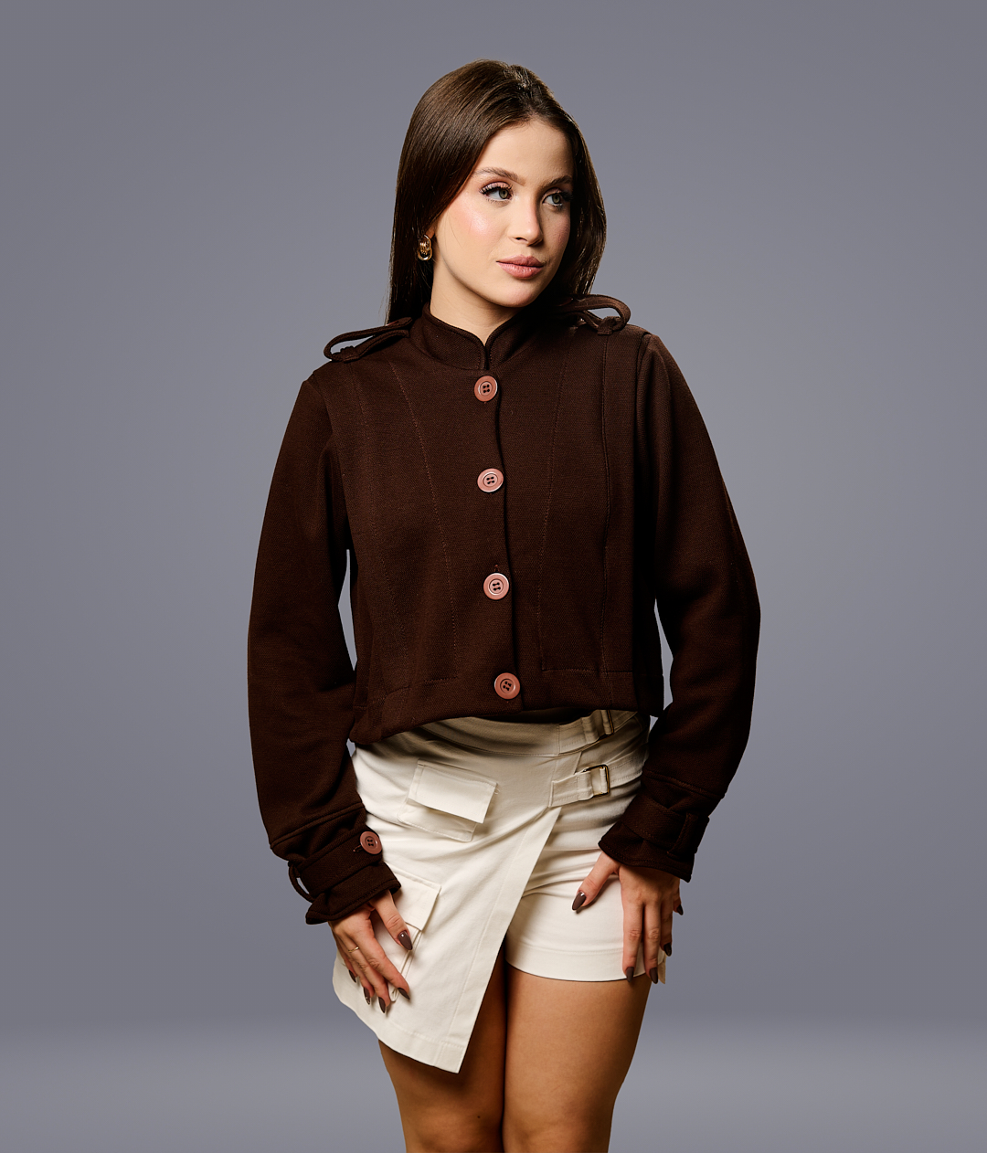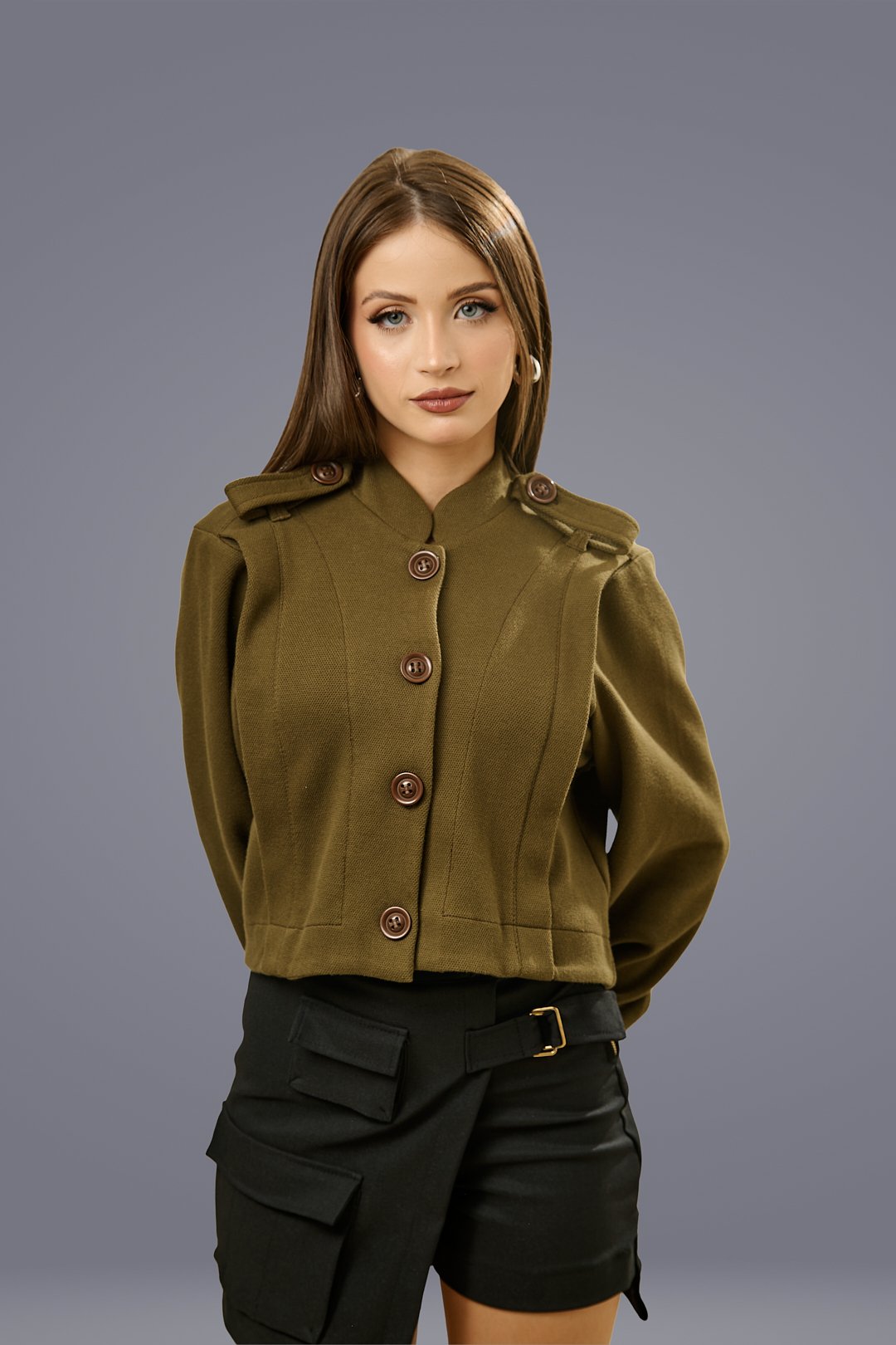 O Casaco possui modelagem reta e comprimento cropped, valorizando a silhueta com um caimento estruturado. Os ombros contam com detalhes de lapela decorativa e botões aplicados, adicionando um toque de charme e elegância à peça. As mangas longas possuem ajuste na barra com fivelas duplas, permitindo um ajuste perfeito. Disponível nas cores bege, marrom e verde militar, esse casaco é a escolha ideal para quem busca estilo, conforto e versatilidade.